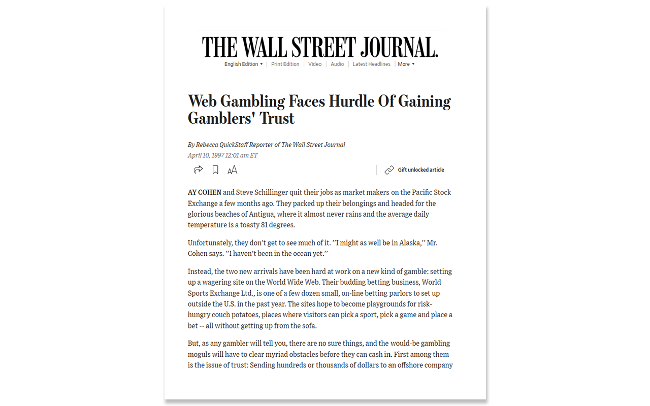 World Sports Exchange, WSEX.com, officially launched in November 1996. The early days were filled with all the excitement and promise that comes with a startup along with a lot of attention, small successes and big problems.