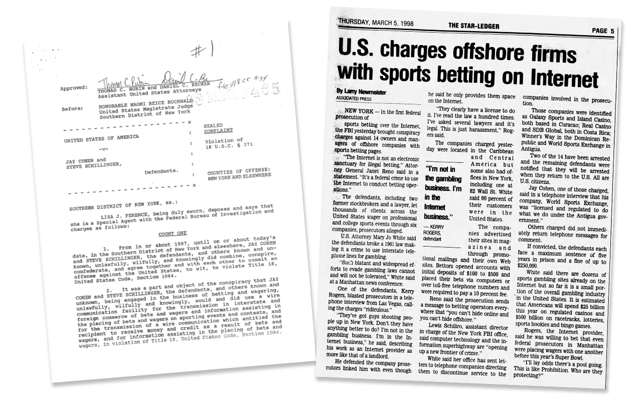 Less than two years after launching WSEX.com, the DOJ charged Jay Cohen and 13 other offshore sports book operators for violating U.S. gambling laws.